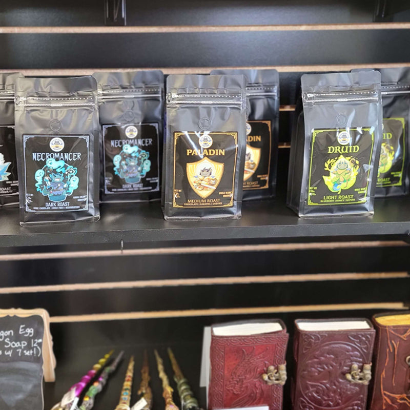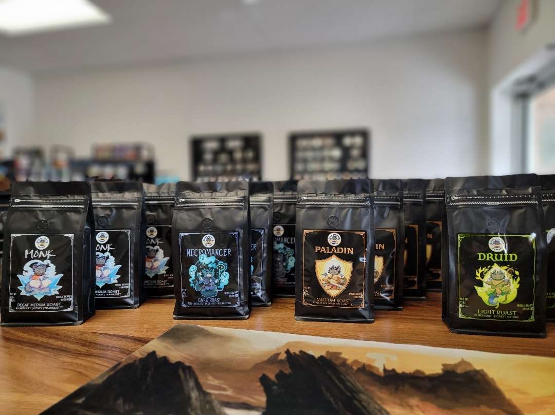 While most coffee companies primarily work with coffee shops, we specialize in working with game stores of all types! Our roots are in TTRPGs and gaming and want to make coffee accessible to all gamers! Coffee isn't typically something you see in a game store but partners that we work with have boasted about how much their customers love seeing something interesting and unique.